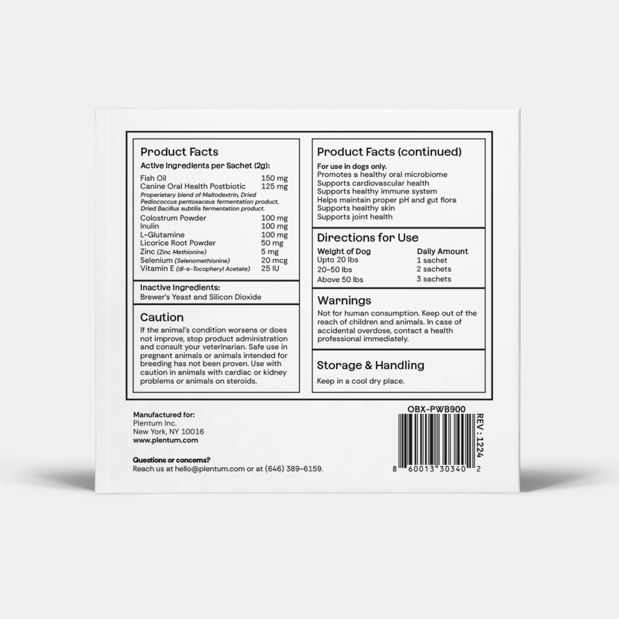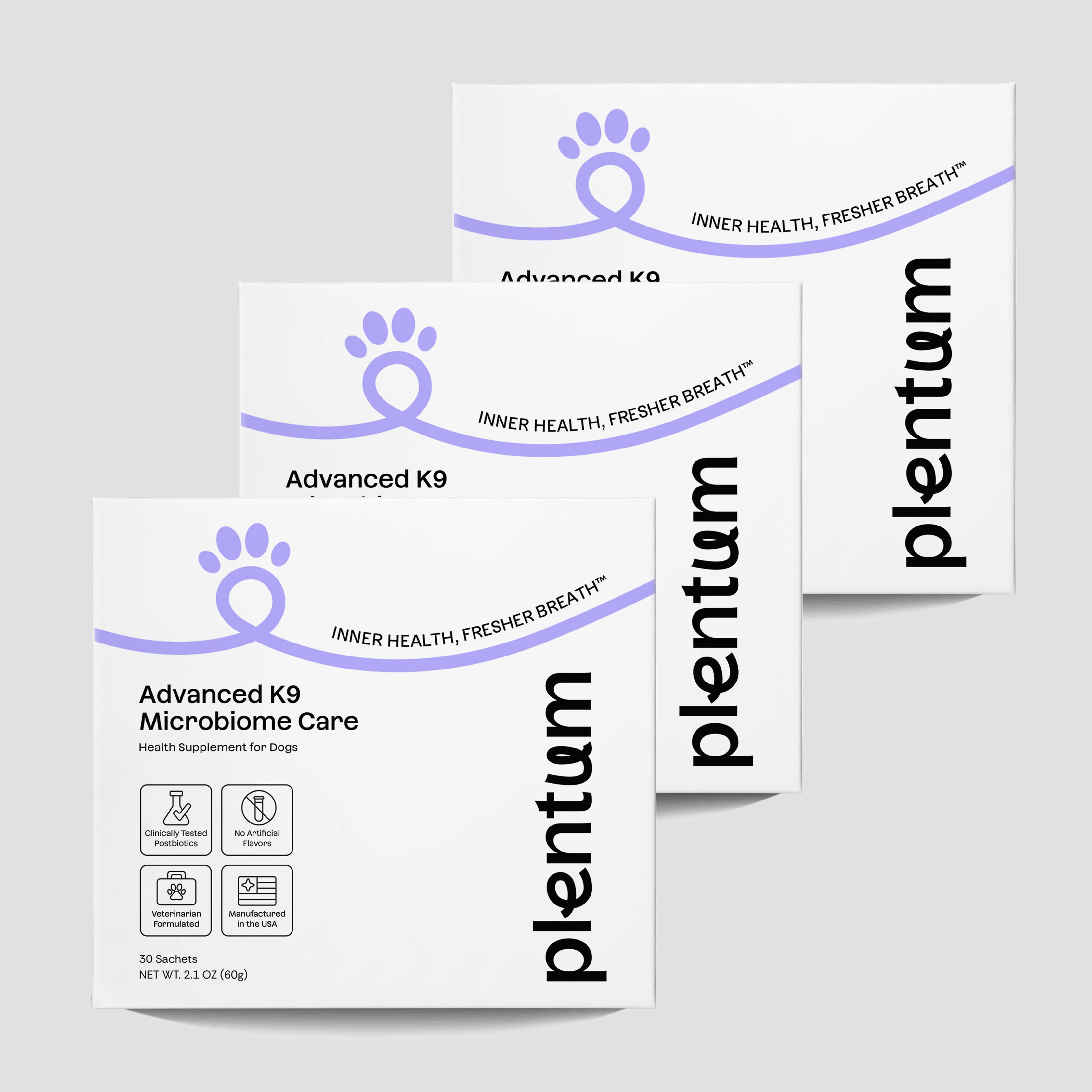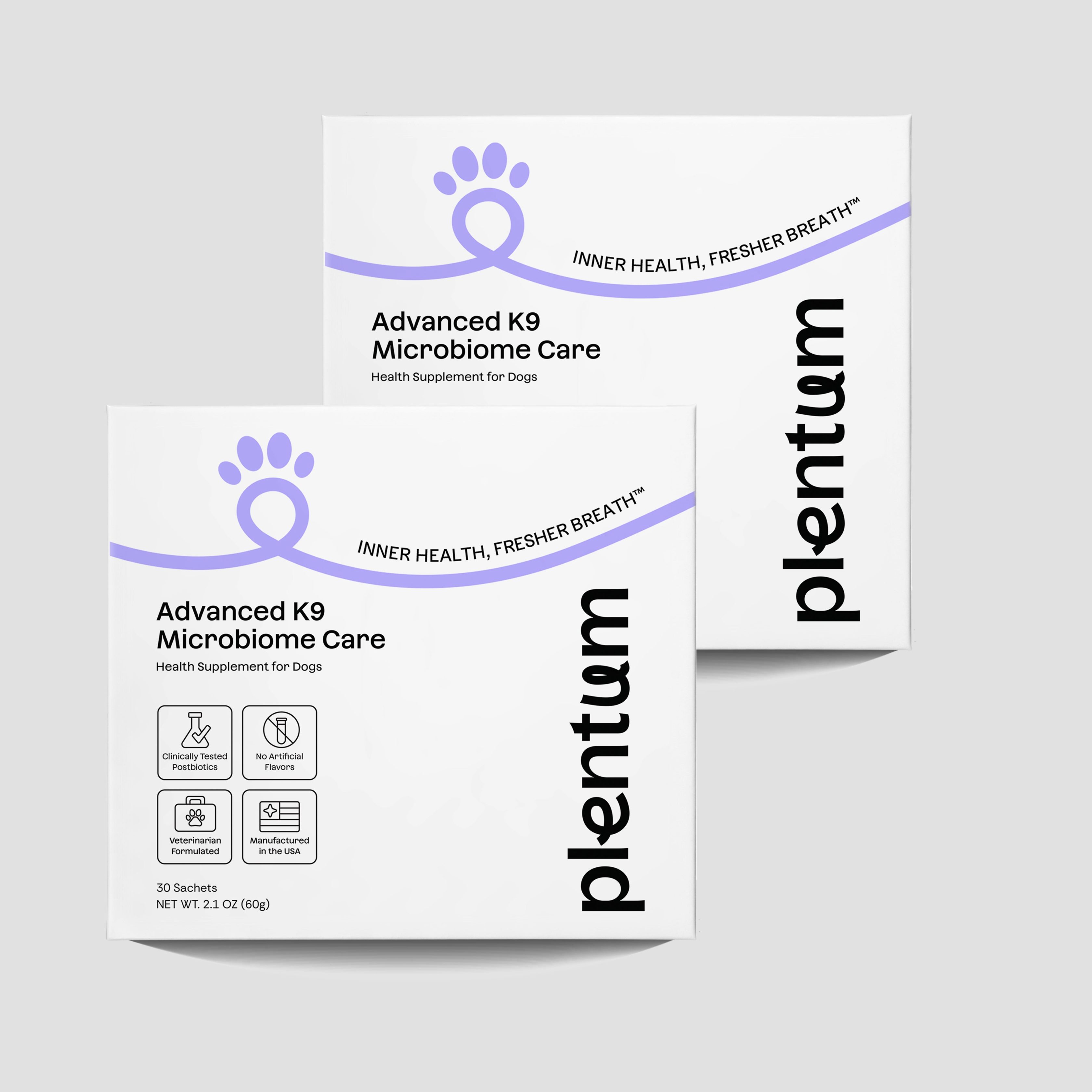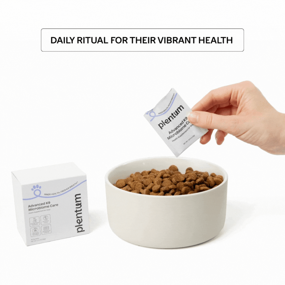 Plentum’s Advanced K9 Microbiome Care: All-in-one powder with unique oral health postbiotic. Supports gut. immune. skin. coat & joint health naturally